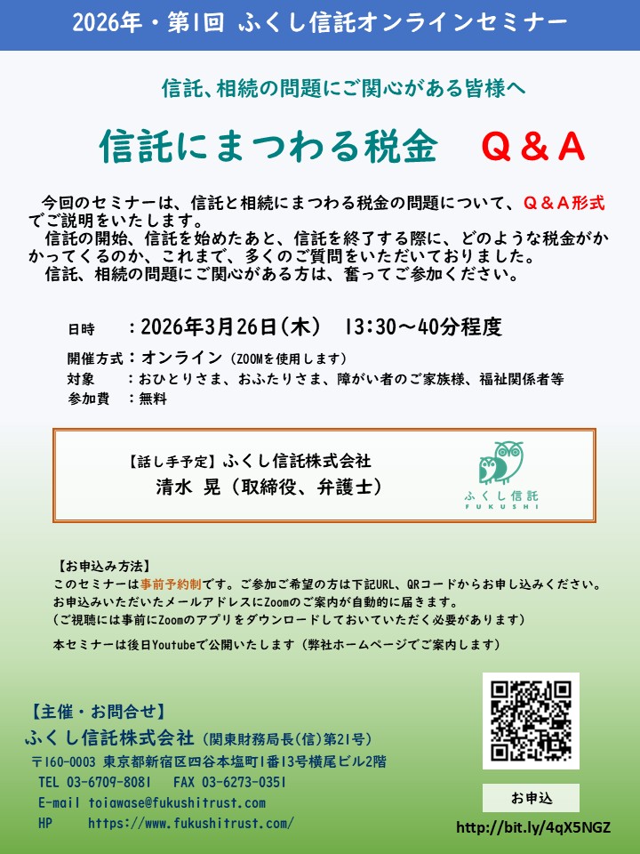 ふくし信託のオンラインセミナー、今年初回、2026年第1回目 開催のお知らせです。